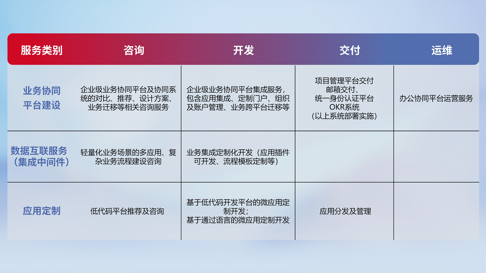 针对钉钉、、、、企微、、、、IDaas等平台级产品提供产品的规划、、、方案、、、交付、、、定制化开发等服务,,,,实现如统一协同办公、、智能客户服务、、混合会议管理、、、智能数据查询、、等业务场景,,实现数字化转型。。。